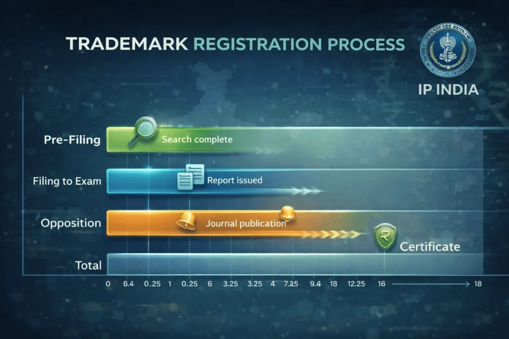 Delays from objections add 3-6 months. Track via IP India portal.