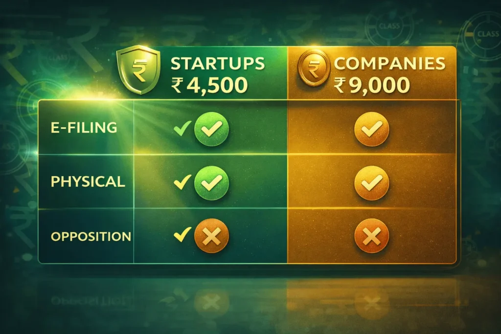 Startups/MSMEs: ₹4,500 per class (e-filing); others: ₹9,000. Add ₹2,000-10,000 for agents.